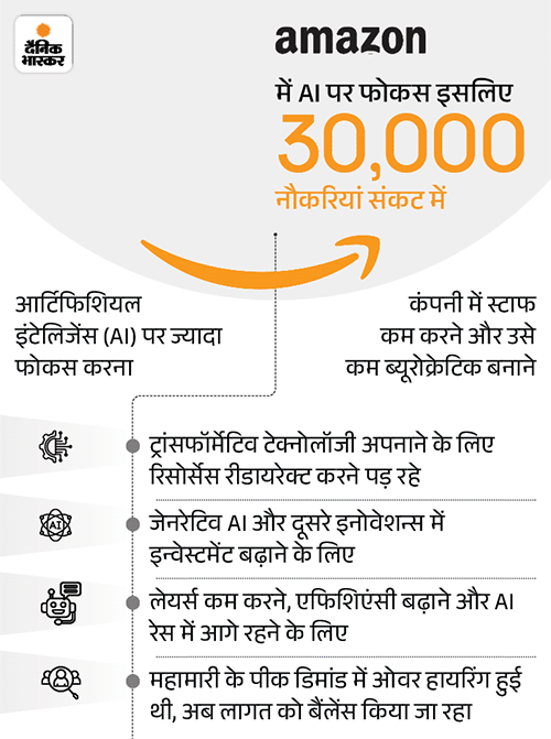 अमेजन के दुनिया भर में करीब 3.5 लाख ऑफिस कर्मचारी हैं, जिनमें से लगभग 10% यानी 30,000 लोगों को नौकरी से हाथ धोना पड़ेगा। हालांकि, कंपनी ने साफ किया है कि उसके वेयरहाउस और डिस्ट्रीब्यूशन नेटवर्क में काम करने वाले 15 लाख कर्मचारियों पर इस कटौती का कोई असर नहीं होगा।