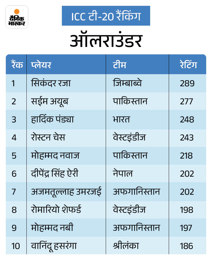 ऑलराउंडर्स रैंकिंग में हार्दिक एक स्थान ऊपर आए टी-20 ऑलराउंडर्स रैंकिंग में भारतीय खिलाड़ियों को भी फायदा हुआ है। हार्दिक पांड्या एक स्थान की छलांग लगाकर तीसरे नंबर पर पहुंच गए हैं, जबकि शिवम दुबे ने छह पायदान की बढ़त के साथ 11वां स्थान हासिल किया है। इस लिस्ट में जिम्बाब्वे के अनुभवी खिलाड़ी सिकंदर रजा टॉप पर बरकरार हैं।