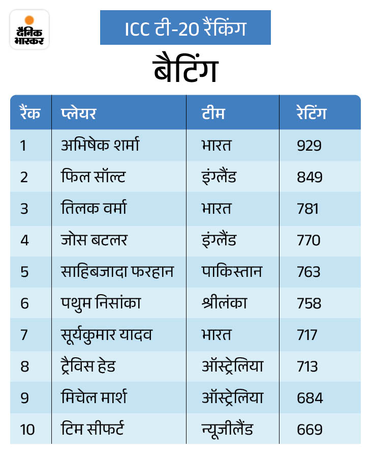 अभिषेक ने न्यूजीलैंड के खिलाफ जारी टी-20 सीरीज के पहले मैच में 84 और तीसरे 68* रन की पारी खेली थी। वहीं, टीम इंडिया के टी-20 कप्तान सूर्यकुमार यादव ने एक बार फिर टॉप-10 में जगह बना ली है।