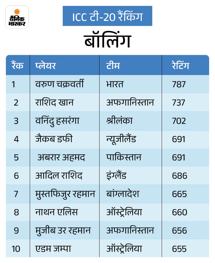 भारत के तिलक वर्मा 781 अंकों के साथ तीसरे नंबर पर बने हुए हैं। ऑलराउंडर्स में हार्दिक पंड्या तीसरे नंबर पर पहुंच गए हैं।
