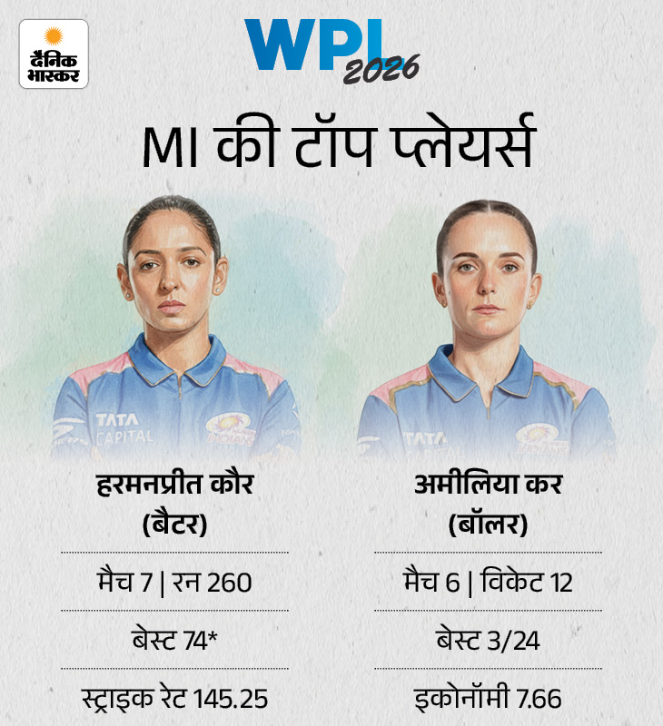हरमनप्रीत कौर टॉप बैटर मुंबई की कप्तान हरमनप्रीत कौर इस सीजन टीम की सबसे सफल बल्लेबाज हैं। उन्होंने 7 मैचों में 260 रन बनाए हैं, जिसमें नाबाद 74 रन उनका बेस्ट स्कोर है। अमेलिया कर मुंबई की टॉप बॉलर हैं। उन्होंने 6 मैचों में 12 विकेट लिए हैं, जिसमें 24 रन देकर 3 विकेट उनका बेस्ट प्रदर्शन रहा।