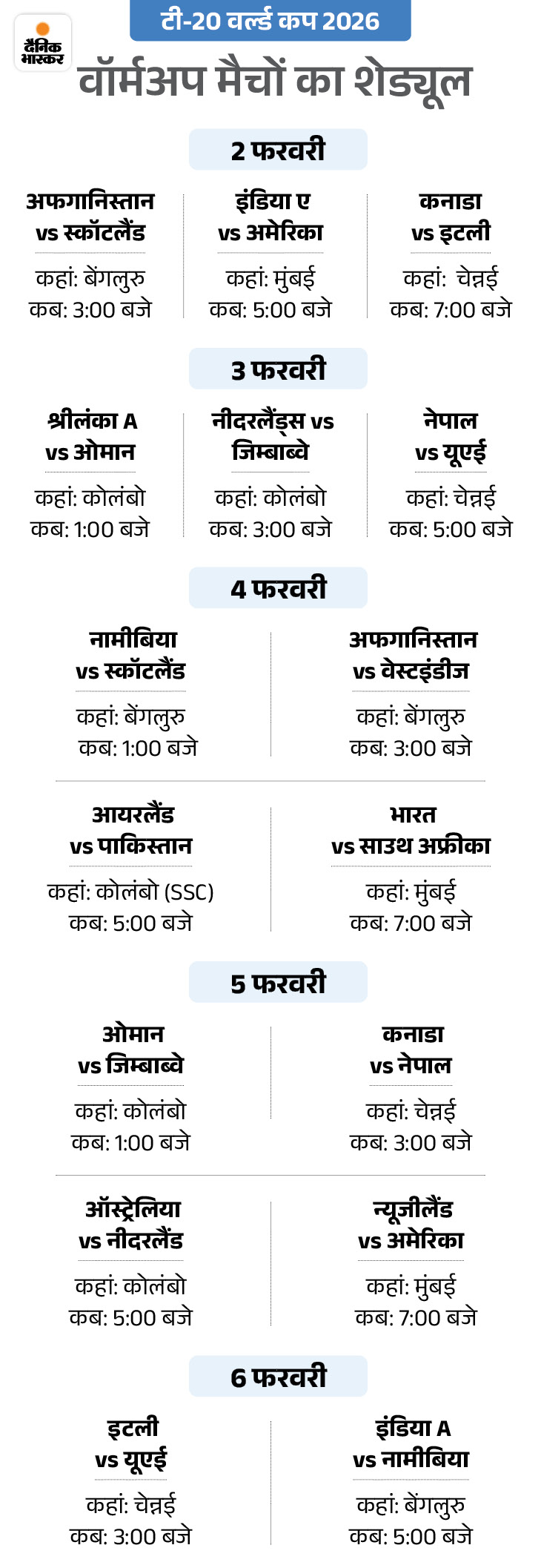 अफगानिस्तान और स्कॉटलैंड में पहला मैच वॉर्मअप मैचों की शुरुआत अफगानिस्तान और स्कॉटलैंड के मैच के साथ होगी। यह मुकाबला बेंगलुरु स्थिति BCCI के सेंटर ऑफ एक्सीलेंस के मैदान-1 में खेला जाएगा। दूसरी ओर मुंबई के DY पाटील स्टेडियम में इंडिया ए की टीम यूनाइटेड स्टेट ऑफ अमेरिका (USA) के साथ खेलेगी। पहले दिन कनाडा और इटली का मैच चेन्नई में खेला जाएगा।