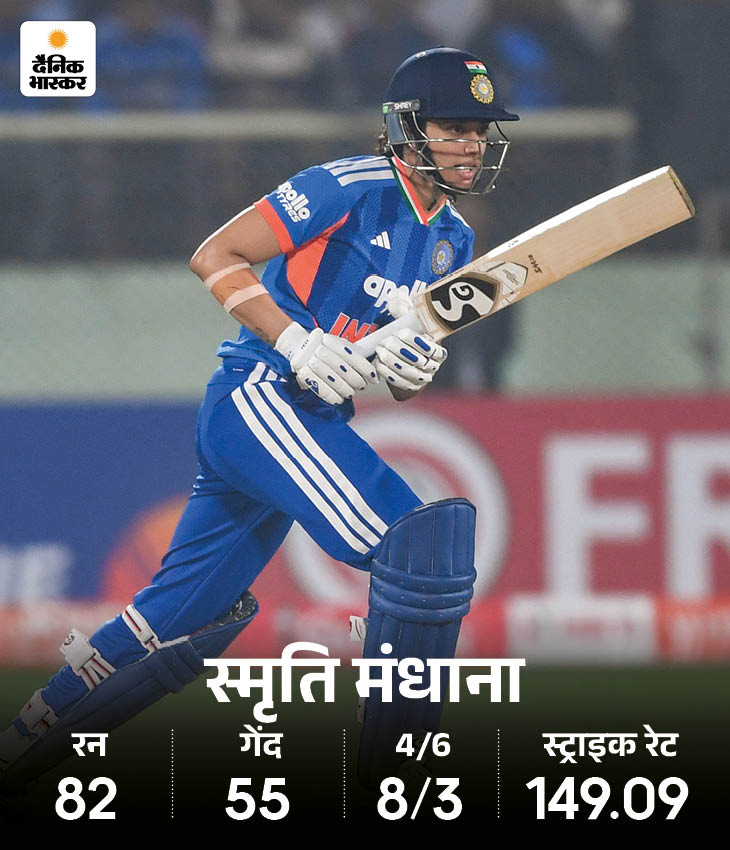 इस मैच में स्मृति मंधाना ने 55 गेंदों में 8 चौके और 3 छक्कों से साथ 82 रनों की शानदार पारी खेली। इसी प्रदर्शन के लिए उन्हें ‘प्लेयर ऑफ द मैच’ चुना गया। वहीं जेमिमा रोड्रिग्स के ने 46 गेदों में 59 रनों की पारी खेली।