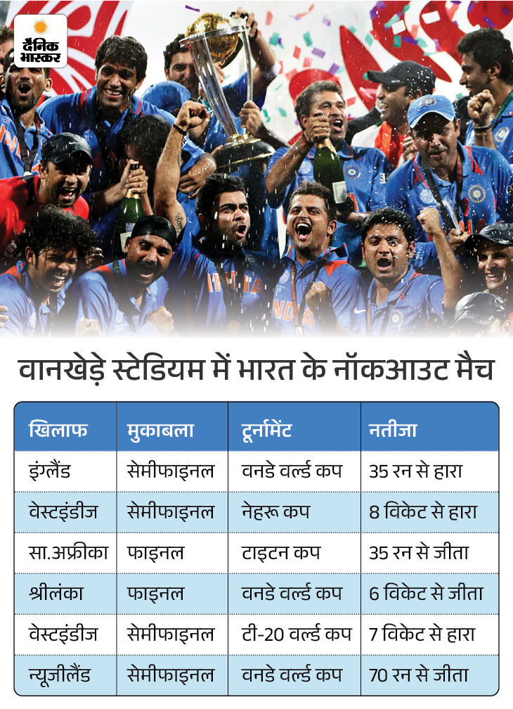 भारत को इस मैदान पर इकलौती सेमीफाइनल जीत 2023 के वनडे वर्ल्ड कप में मिली, तब टीम ने न्यूजीलैंड को 70 रन से हराया था। वानखेड़े में टीम इंडिया ने 2 फाइनल भी खेले हैं, दोनों में टीम को जीत मिली। 1996 में भारत ने साउथ अफ्रीका को टाइटन कप हराया, वहीं 2011 में श्रीलंका को वनडे वर्ल्ड कप में मात दी।