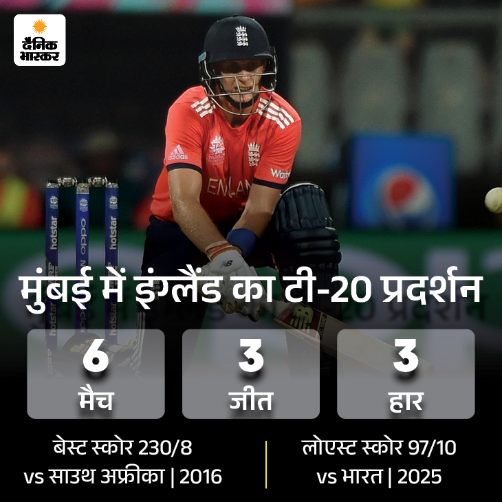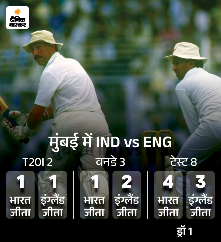 वानखेड़े स्टेडियम में भारत और इंग्लैंड के बीच तीनों फॉर्मेट के 13 मुकाबले खेले गए। 6 में भारत और 6 में ही इंग्लैंड को जीत मिली। एक टेस्ट ड्रॉ भी रहा। 2012 में जब इंग्लैंड ने भारत को 2-1 से टेस्ट सीरीज हराई थी, तब इंग्लिश टीम ने वानखेड़े में 10 विकेट से मुकाबला जीता था। टी-20 में दोनों को 1-1 जीत मिली। वहीं वनडे में इंग्लैंड का पलड़ा भारी रहा।