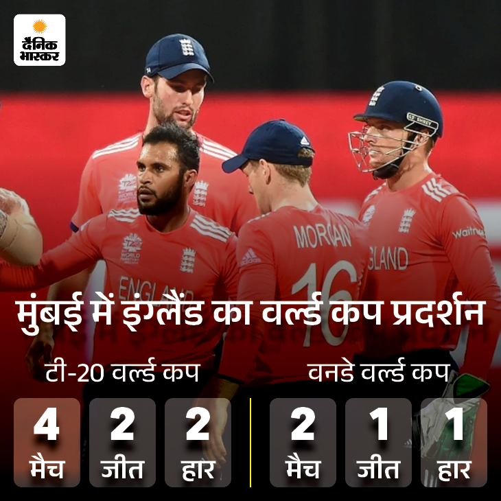 टी-20 वर्ल्ड कप में इंग्लैंड ने यहां 4 मैच खेले, 2 जीते और 2 ही गंवाए। टीम को दोनों हार वेस्टइंडीज के खिलाफ मिली। इस बार टीम ने मुंबई में 2 मैच खेले, नेपाल को 4 रन के करीबी अंतर से हराया, वहीं वेस्टइंडीज के खिलाफ 30 रन की हार मिली। वनडे वर्ल्ड कप में भी इंग्लैंड यहां 2 मैच खेल चुका है। 1 में जीत और 1 में ही हार मिली।