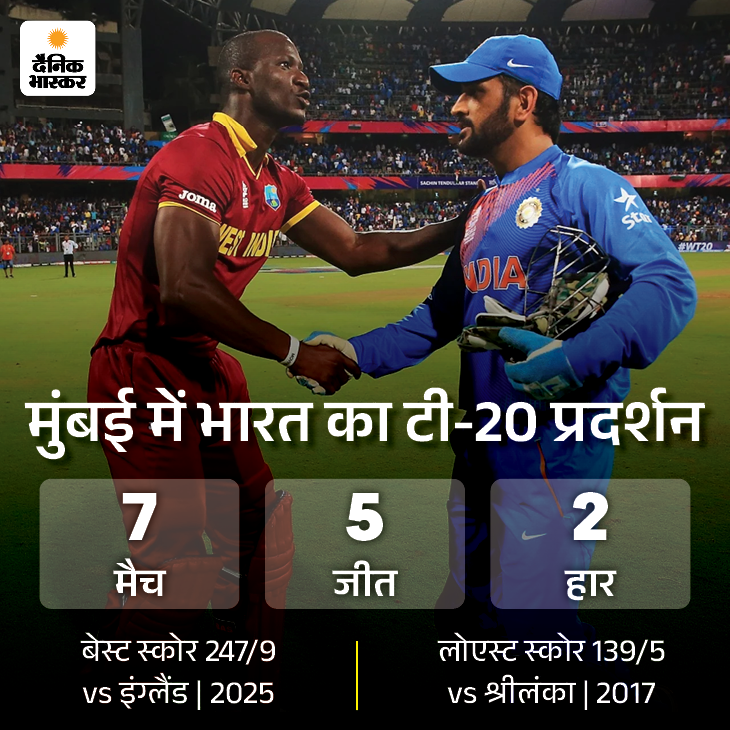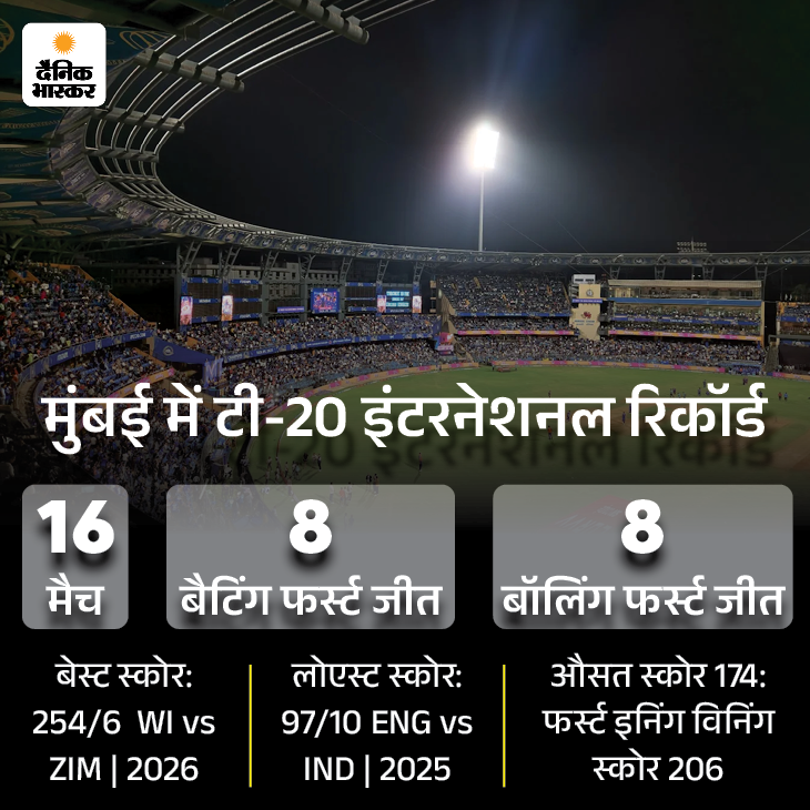 मुंबई में भारत ने 2012 में पहला टी-20 इंग्लैंड के खिलाफ ही खेला था, जिसमें टीम को हार मिली थी। उसके बाद टीम इंडिया ने यहां 6 टी-20 खेले, 5 जीते और महज 1 गंवाया। हालांकि, एक हार वर्ल्ड कप सेमीफाइनल में ही रही। इस मैदान पर भारत का बेस्ट स्कोर 247 रन है, जो टीम ने पिछले साल इंग्लैंड के खिलाफ ही बनाया था।