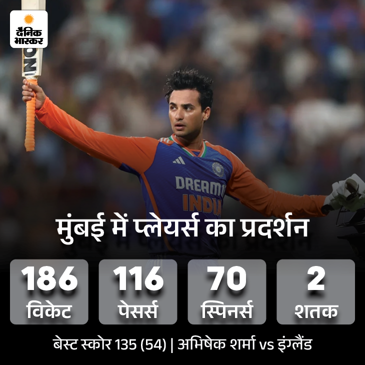 मुंबई में 2 ही बैटर्स टी-20 शतक लगा सके हैं। वेस्टइंडीज के क्रिस गेल ने 2016 में इंग्लैंड के खिलाफ ही वर्ल्ड कप सेंचुरी लगाई थी। वहीं 2025 में भारत के अभिषेक शर्मा इंग्लैंड के खिलाफ 135 रन की पारी खेल चुके हैं। जो इस मैदान पर सबसे बड़ा इंडिविजुअल स्कोर है।