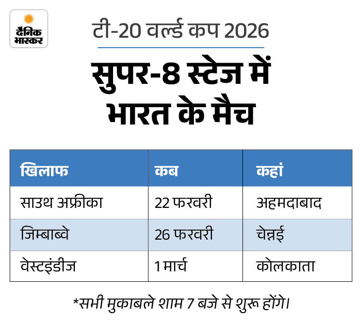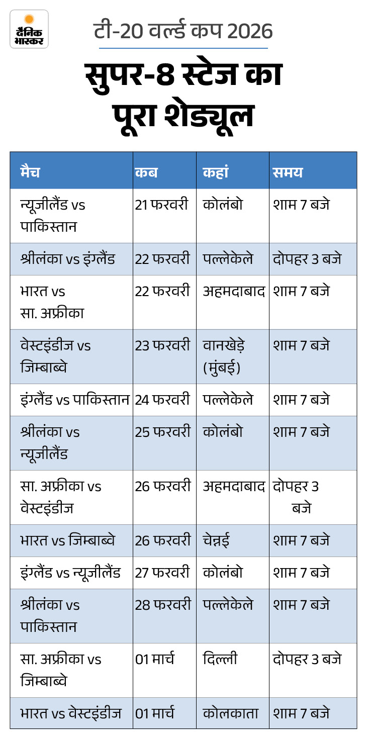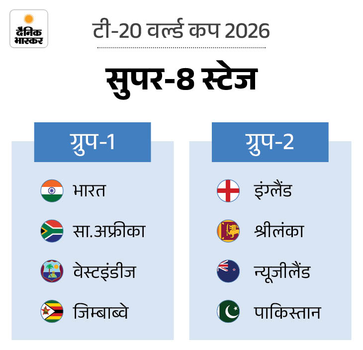 टी-20 वर्ल्ड कप 2026 की सुपर-8 टीमें तय हो चुकी है। ग्रुप ए से भारत और पाकिस्तान ने अगले दौर में प्रवेश किया है। लेकिन, इन टीमों के मुकाबले कब और कहां होंगे? किस टीम को कौन से ग्रुप में रखा गया है और उसका मैच कब होगा।