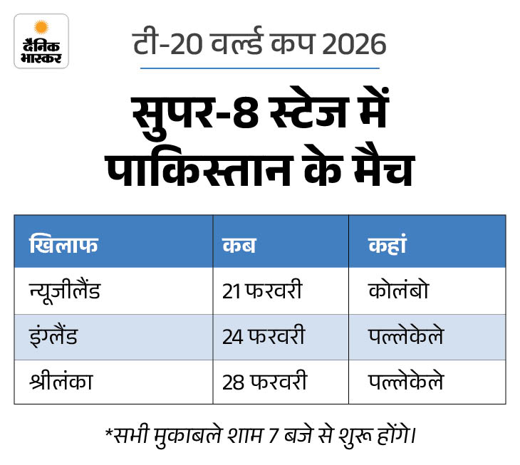 PAK-NZ के बीच पहला ग्रुप स्टेज मैच 7 फरवरी से शुरू हुए टूर्नामेंट के सुपर-8 स्टेज की शुरुआत 21 फरवरी से होगी। पहला मैच न्यूजीलैंड और पाकिस्तान का मुकाबला खेला जाएगा। ग्रुप-2 में न्यूजीलैंड के अलावा, इंग्लैंड और श्रीलंका ने भी क्वालिफाई कर लिया है।