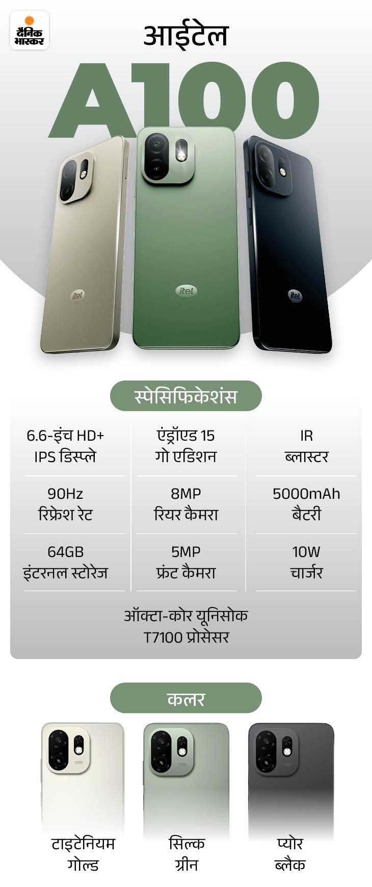 पीछे की तरफ स्टाइलिश टेक्स्चर दिया गया है। यहां कैमरा मॉड्यूल और फिंगरप्रिंट सेंसर की पोजीशन काफी क्लीन रखी गई है। आईटेल A100 में सिल्क ग्रीन, प्योर ब्लैक और टाइटेनियम गोल्ड जैसे तीन कलर ऑप्शन मिलेंगे।