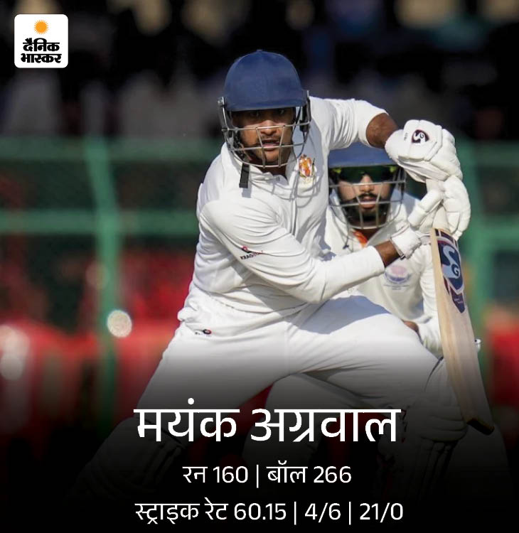 कर्नाटक से मयंक अग्रवाल का शतक 584 के सामने कर्नाटक की शुरुआत बेहद खराब रही। टीम ने 57 रन पर 4 विकेट गंवा दिए। केएल राहुल 13 और कप्तान देवदत्त पडिक्कल 11 रन बनाकर आउट हुए। करुण नायर और रविचंद्रन स्मरण खाता भी नहीं खोल सके। पूर्व कप्तान मयंक अग्रवाल ने फिर श्रेयस गोपाल और कृतिक कृष्णा के साथ पारी संभाली। हालांकि, दोनों के आउट होते ही कर्नाटक की पारी बिखर गई।