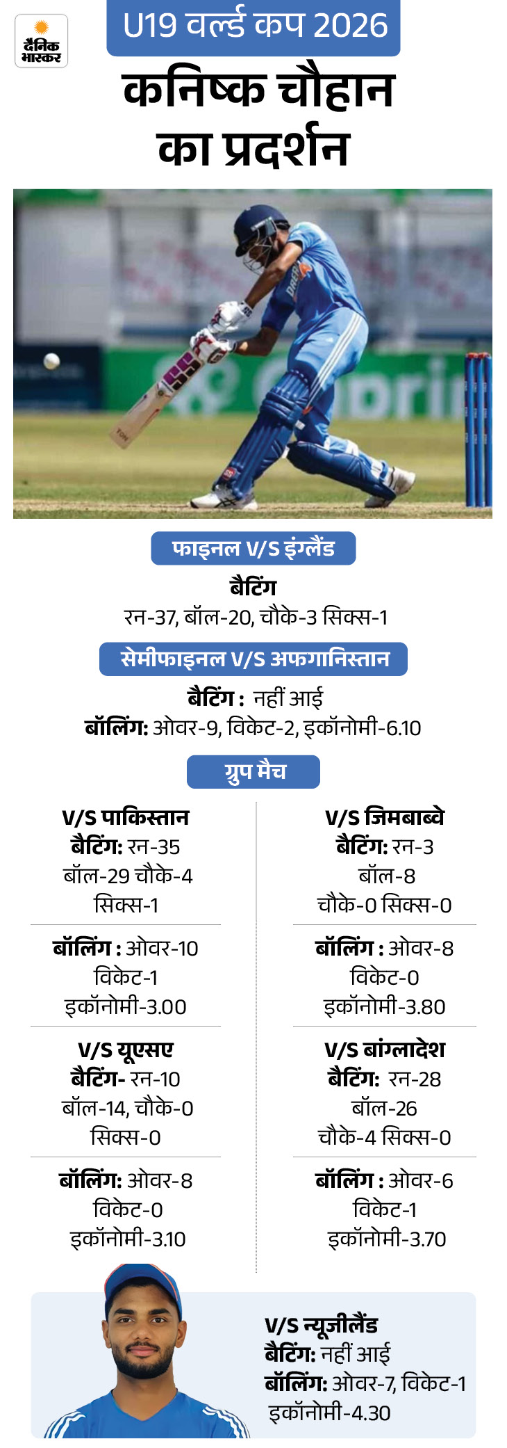 आखिरी ओवर में कनिष्क ने धुआंधार बैटिंग की। एक छक्के और दो चौके की मदद से 18 रन बनाए और टीम का स्कोर 400 पार कराया। इसी की बदौलत भारत ने 50 ओवर में 411 रन बनाते हुए इंग्लैंड को 412 रन का टारगेट दिया। यह इस टूर्नामेंट के इतिहास में फाइनल का सबसे बड़ा स्कोर है।