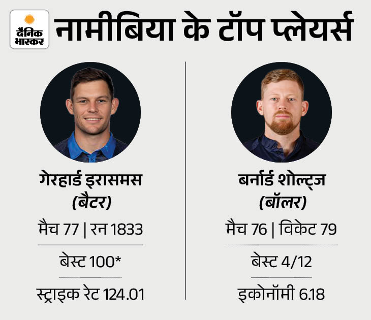 कप्तान गेरहार्ड इरासमस टॉप रन स्कोरर हैं। उन्होंने अब तक खेले 77 मैचों में 124.01 की स्ट्राइक रेट से 1833 रन बनाए हैं। गेंदबाजी में नामीबिया के रूबेन ट्रम्पलमैन जबरदस्त फॉर्म में हैं, उन्होंने साउथ अफ्रीका के खिलाफ पिछले मैच में 3 विकेट लिए थे। बर्नार्ड शोल्ट्ज नामीबिया के टॉप विकेट टेकर हैं। उन्होंने 76 मैचों में 74 विकेट लिए थे।