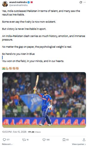 मेन इन ब्लू को सलाम- आनंद महिंद्रा बिजनेसमैन आनंद महिंद्रा ने लिखा, भारत ने इस मुकाबले में प्रतिभा और प्रदर्शन के दम पर पाकिस्तान को पूरी तरह पछाड़ दिया और कई लोगों को यह नतीजा पहले से तय सा लगा। कुछ तो यह भी कहने लगे हैं कि अब यह राइवलरी पहले जैसी नहीं रही। लेकिन खेल में जीत कभी भी तय नहीं होती। भारत-पाकिस्तान का मुकाबला अपने साथ इतिहास, जज्बात और जबरदस्त दबाव लेकर आता है। कागज पर चाहे जितना भी अंतर दिखे, मानसिक दबाव हमेशा असली परीक्षा लेता है। ऐसे में मेन इन ब्लू को सलाम, आपने सिर्फ मैदान पर ही नहीं, बल्कि अपने हौसले और हमारे दिलों में भी जीत हासिल की।