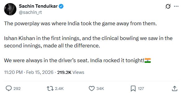 भारत ने धूम मचा दी- सचिन सचिन तेंदुलकर ने एक्स पर लिखा, पावरप्ले ही वो दौर रहा जहां भारत ने मुकाबले को पूरी तरह अपने कब्जे में कर लिया। पहली पारी में ईशान किशन की दमदार बल्लेबाजी ने टीम को मजबूत शुरुआत दिलाई, जबकि दूसरी पारी में भारतीय गेंदबाजों की सटीक और अनुशासित गेंदबाजी ने मैच पर शिकंजा कस दिया। शुरुआत से ही टीम ड्राइविंग सीट पर नजर आई और अंत तक दबदबा बनाए रखा। भारत ने आज शानदार प्रदर्शन करते हुए मुकाबले में पूरी तरह धूम मचा दी।