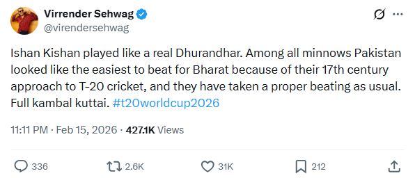 भारत का हर डिपार्टमेंट में बेहतर प्रदर्शन- सहवाग वीरेंद्र सहवाग ने लिखा, ईशान किशन ने सच में धुरंधर बल्लेबाज की तरह खेल दिखाया। उनकी पारी ने मैच का रुख ही बदल दिया। भारत के सामने पाकिस्तान की टीम काफी दबाव में नजर आई और टी-20 क्रिकेट के तेज अंदाज के मुकाबले उनका खेल थोड़ा पुराना और धीमा लगा। नतीजा यह रहा कि उन्हें एकतरफा हार का सामना करना पड़ा। टीम इंडिया ने हर डिपार्टमेंट में बेहतर प्रदर्शन करते हुए पूरी तरह दबदबा बनाए रखा और मुकाबला अपने नाम किया।