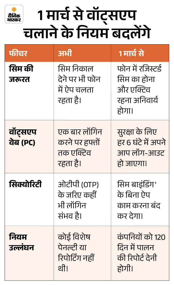 केंद्र सरकार ने साफ कर दिया है कि ‘सिम बाइंडिंग’ के नियमों को लागू करने की 28 फरवरी की डेडलाइन नहीं बढ़ाई जाएगी। नए नियमों के तहत फोन में सिम कार्ड न होने पर वॉट्सएप जैसे मैसेजिंग एप काम नहीं करेंगे। कंप्यूटर पर लॉगिन वॉट्सएप भी 6 घंटे में लॉग-आउट हो जाएगा।